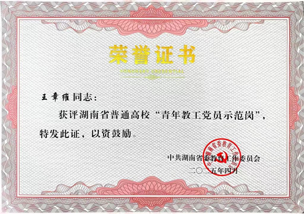 教师王章维获评湖南省普通高校“青年教工党员示范岗”