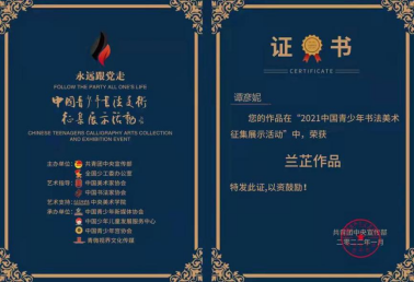 高温结构材料研究所第一党支部谭彦妮同志荣获“永远跟党走—中国青少年书法美术征集展示活动”二等奖
