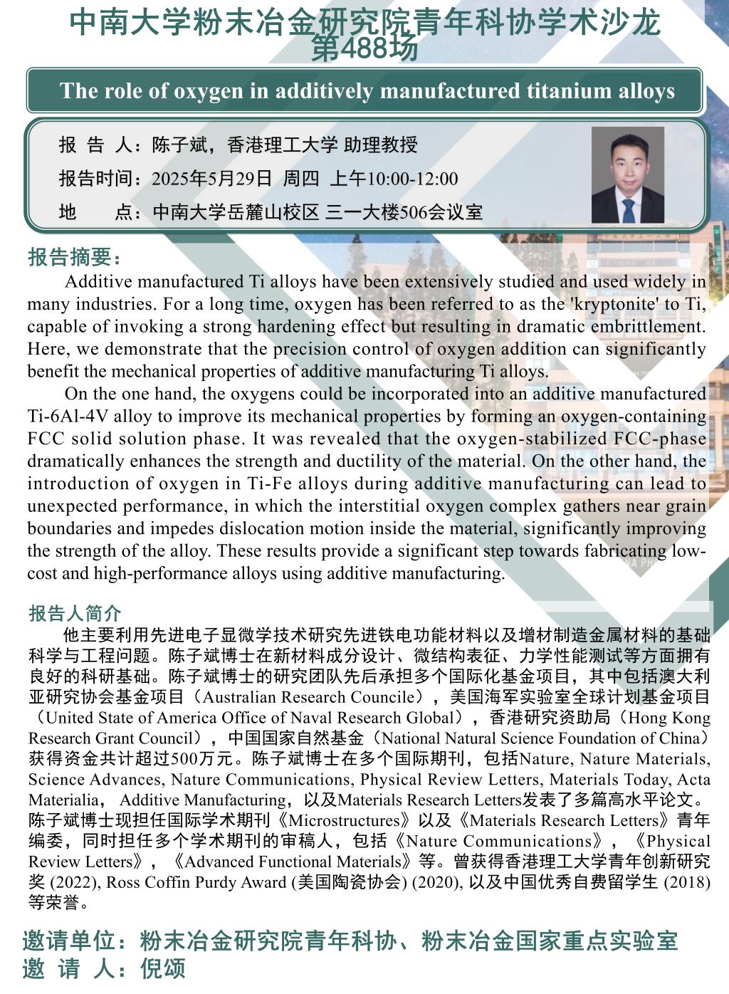On the one hand,the oxygens could be incorporated into an additive manufacturedT1-6Al-4V alloy to improve its mechanical properties by forming an oxygen-containingFCC solid solution phase.It was revealed that the oxygen-stabilized FCC-phasedramatically enhances the strength and ductility of the material.On the other hand,theintroduction of oxygen in Ti-Fe alloys during additive manufacturing can lead tounexpected performance,in which the interstitial oxygen complex gathers near grainboundaries and impedes dislocation motion inside the material,significantly improvingthe strength of the alloy.These results provide a significant step towards fabricating low-cost and high-performance alloys using additive manufacturing.