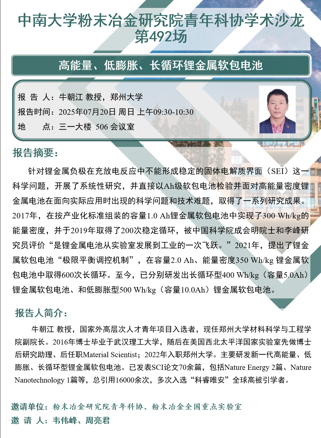 牛朝江 教授,国家外高层次人才青年项目入选者,现任郑州大学材料科学与工程学院副院长。2016年博士毕业于武汉理工大学,随后在美国西北太平洋国家实验室先做博士后研究助理、后任职Material Scientist;2022年入职郑州大学。主要研发新一代高能量、低膨胀、长循环型锂金属软包电池。已发表SCI论文70余篇,包括NatureEnergy 2篇、NatureNanotechnology 1篇等,总引用16000余次,多次入选“科唯安”全球高被引学者。