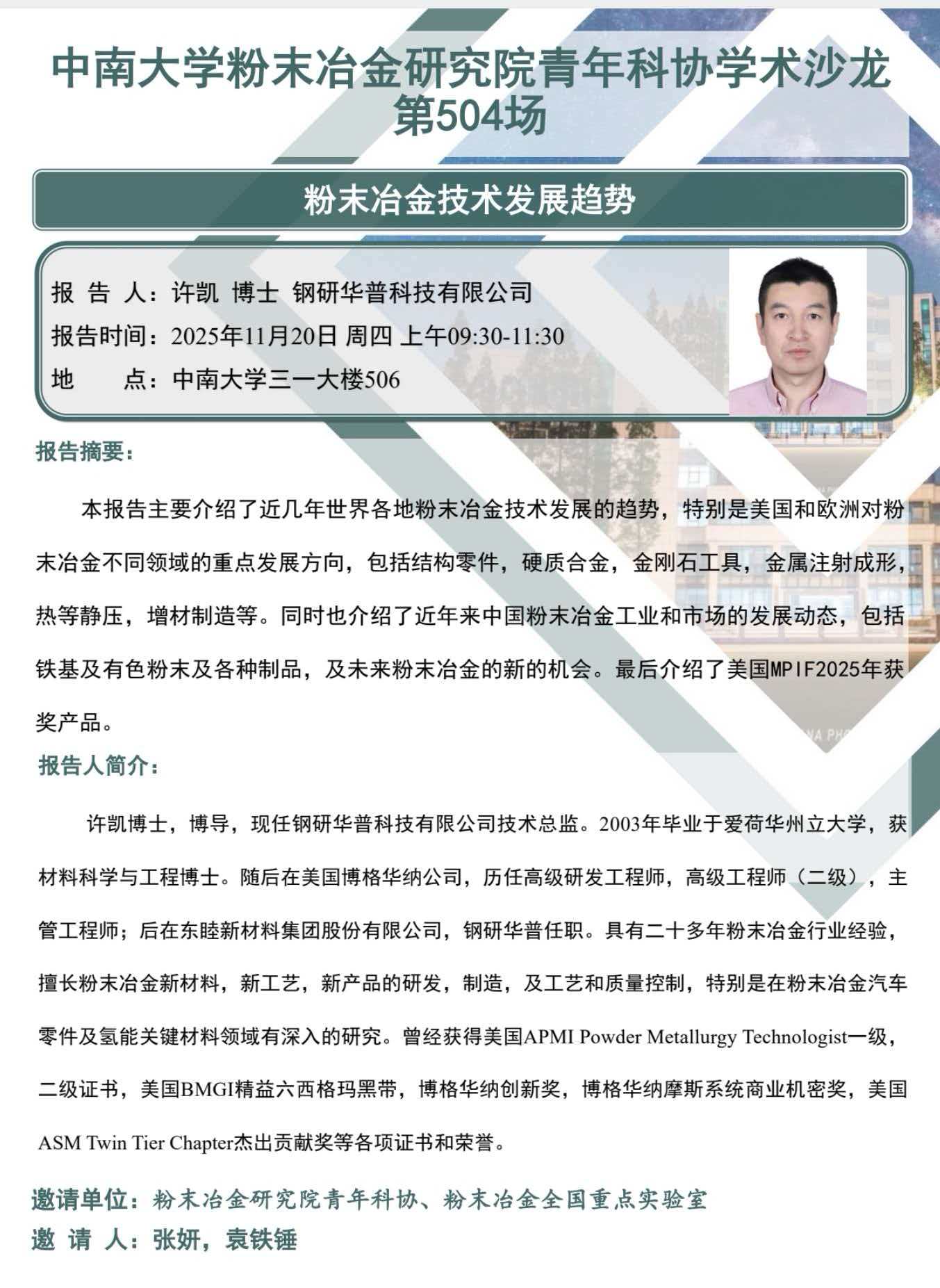 许凯博士,博导,现任钢研华普科技有限公司技术总监。2003年毕业于爱荷华州立大学,获材料科学与工程博士。随后在美国博格华纳公司,历任高级研发工程师,高级工程师(二级),主管工程师;后在东睦新材料集团股份有限公司,钢研华普任职。具有二十多年粉未冶金行业经验擅长粉末冶金新材料,新工艺,新产品的研发,制造,及工艺和质量控制,特别是在粉未冶金汽车零件及氢能关键材料领域有深入的研究。曾经获得美国APMIPowder Metallurgy Technologist一级二级证书,美国BMGI精益六西格玛黑带,博格华纳创新奖,博格华纳摩斯系统商业机密奖,美国ASM Twin Tier Chapter杰出贡献奖等各项证书和荣誉。