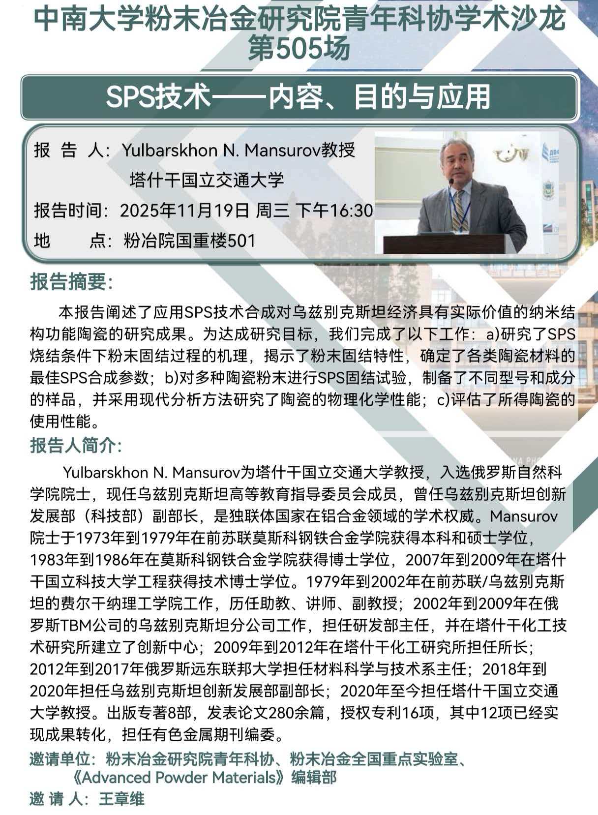 Yulbarskhon N.Mansurov为塔什干国立交通大学教授,入选俄罗斯自然科学院院士,现任乌兹别克斯坦高等教育指导委员会成员,曾任乌兹别克斯坦创新发展部(科技部)副部长,是独联体国家在铝合金领域的学术权威。Mansurov院士于1973年到1979年在前苏联莫斯科钢铁合金学院获得本科和硕士学位,1983年到1986年在莫斯科钢铁合金学院获得博士学位,2007年到2009年在塔什干国立科技大学工程获得技术博士学位。1979年到2002年在前苏联/乌兹别克斯坦的费尔干纳理工学院工作,历任助教、讲师、副教授:2002年到2009年在俄罗斯TBM公司的乌兹别克斯坦分公司工作,担任研发部主任,并在塔什干化工技术研究所建立了创新中心;2009年到2012年在塔什干化工研究所担任所长;2012年到2017年俄罗斯远东联邦大学担任材料科学与技术系主任:2018年到2020年担任乌兹别克斯坦创新发展部副部长;2020年至今担任塔什干国立交通大学教授。出版专著8部,发表论文280余篇,授权专利16项,其中12项已经实现成果转化,担任有色金属期刊编委。