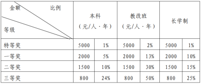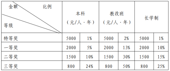 每年9月按学年进行动态评定,用于奖励勤奋学习的在籍在册的本科生。学年奖学金设置等级及奖励标准见表1。