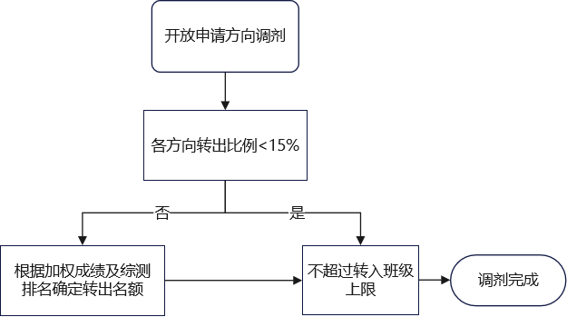 (4)志愿调整申请与审批:在2025年秋季学期开学前两周,学生可根据自身情况提出转方向申请,通过学籍异动调换行政班级的方式实现。为保障教学安排的有序性,转换比例不超过原方向人数的15%,当超出指标数时,按加权平均成绩排名和综测成绩排名确定优先顺序;各专业方向接收转专业学生后,原则上每班不超过30人。调剂流程如图2所示。