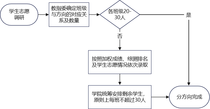 (1)志愿初步调研:学生根据自己的兴趣和职业规划,在分方向前填写志愿在线调研表,选定分方向志愿。调研工作按照专业和班级两个层面摸清各方向的志愿人数情况。