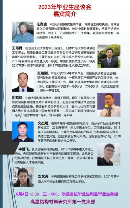 6月4日下午,高温结构材料研究所第一党支部在三一大楼506会议室举办了以“学习二十大,永远跟党走,启航新征程”为主题的毕业生座谈会。本次座谈会由高温结构材料研究所第一党支部书记吴宏老师主持。