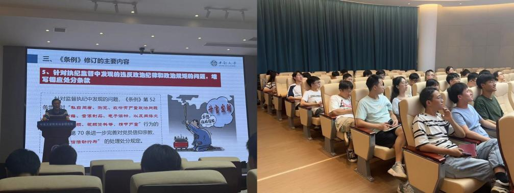 王德志同志围绕《条例》的产生及修订历程、《条例》修订的背景和特点、《条例》修订的主要内容、开展党纪学习教育的重大意义及如何贯彻落实《条例》五个方面,以新增及修改的内容为重点,对党性党风党纪、六大纪律等内容作了生动详细的解读,引导全体师生党员深刻理解《条例》的精神实质和具体规定。他强调,作为党员,必须严格遵守党的纪律,时刻保持清醒的政治头脑,坚决维护党中央权威和集中统一领导。全体党员要认真学习条例内容,将党的纪律要求内化于心、外化于行,做到知行合一。