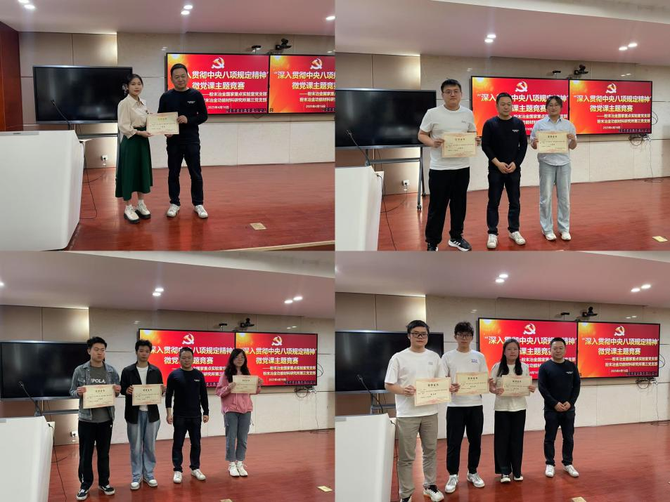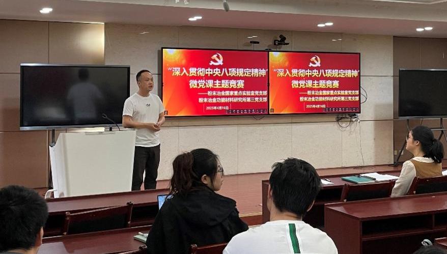 为进一步做好支部党员的革命传统教育工作,提高党员担当作为能力,4月16日,粉末冶金国家重点实验室党支部联合粉末冶金功能材料研究所第三党支部于岳麓山校区三一大楼409会议室举办了“深入贯彻中央八项规定精神”主题微党课竞赛活动,两支部全体党员(含中共预备党员)、入党积极分子出席活动。本次活动由罗行同志主持。