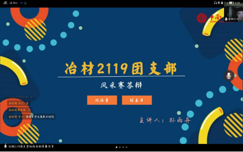 下半场冶材2104团支部、冶材2119团支部、冶材2120团支部、冶材2122团支部、冶材2123团支部五个支部带来了优秀的答辩,评委老师就疫情期间如何更好地开展团日活动进行了提问,冶材2119班团支书结合本班情况以及必威