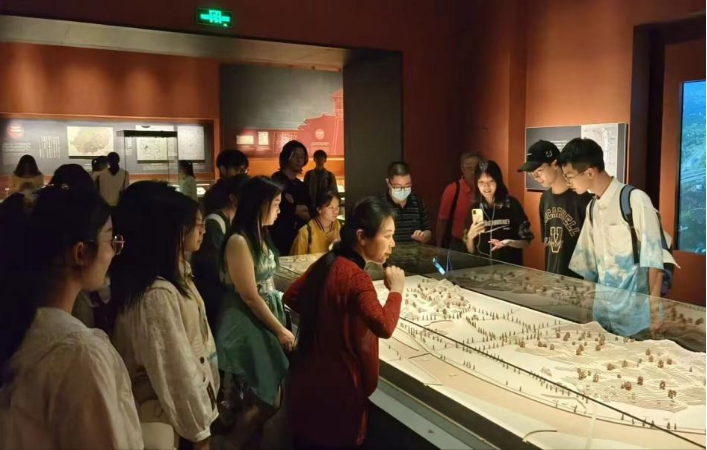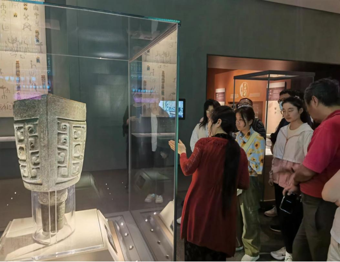 首先,程老师带同学们参观了长沙市博物馆一层的2个展厅“湘江北去——长沙古代历史文化陈列”,以历史发展为序,共分六个展区——湘江晨曦、青铜之乡、楚南重镇、大汉王国、湖湘首邑、明清府城。老师带同学们解读了长沙自20万年前有人类活动以来,历经商周南征、楚人经略、汉庭分封、唐宋繁华至清初定为湖南中枢的发展过程。老师给我们详细介绍每件文物背后的历史故事,这些展品让同学们体会到了古代长沙所处地区经济繁荣以及古人高超的制造工艺。