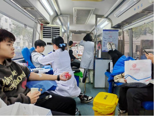 献血车上,同学们积极配合医护人员工作。在手掌一松一握间,一股股鲜血带着生命的希望流入血液袋。年轻的生命用自己的方式保护着有需要的人,有志气的年轻人用实际行动展现着他们的热血青春。