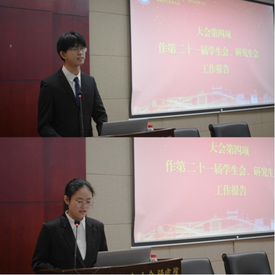 接着,学生会会主席齐杰琪和研究生会主席梁晴分别以“新机遇中求真务实,新学年里开拓创新”和“把握时代脉搏,奏响研会新乐章”为主题分别做工作报告,对这一年度学生会、研究生会取得的成果进行了总结,并就未来工作的开展方向做出汇报。两项报告经与会代表表决,均全票通过。