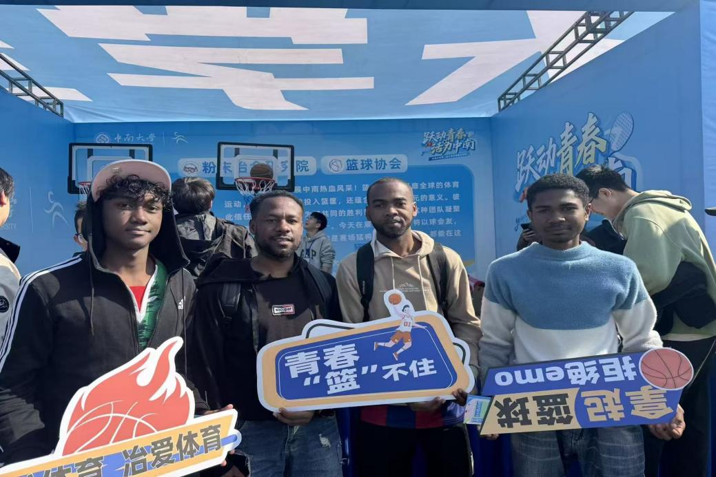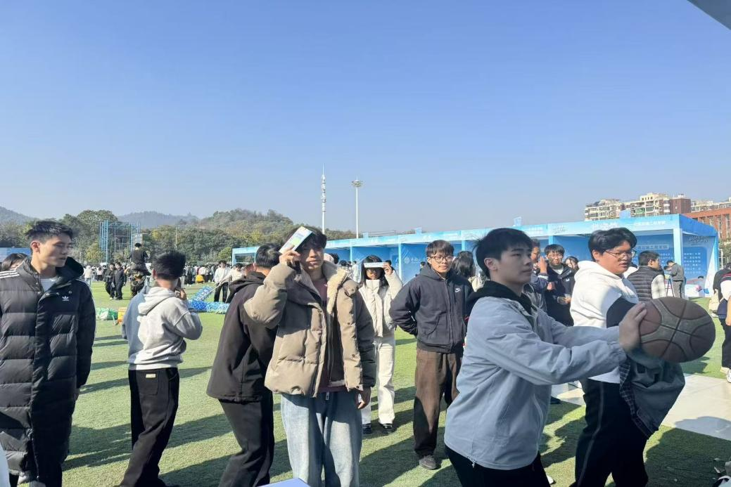 “趣味投篮”区域欢声雷动,参与者需先原地转圈三周,在眩晕中寻找篮筐。篮球抛出时的各种“离谱”轨迹,引得现场笑声与惊呼不断,更吸引了众多师生驻足围观。此外还有中外学子同场竞技,小小篮球成为连接彼此友谊的纽带。