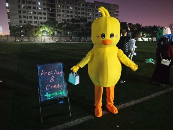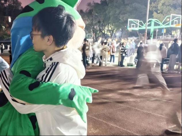 活动现场,两名身穿玩偶服的志愿者和同学们热情相拥。同学们被可爱的玩偶所吸引,积极与玩偶互动。拥抱结束后,同学们可领取到精心准备的棉花糖。糖果的丝丝酸甜传递着春日的活力,温暖与甜蜜洋溢在春日的校园里。