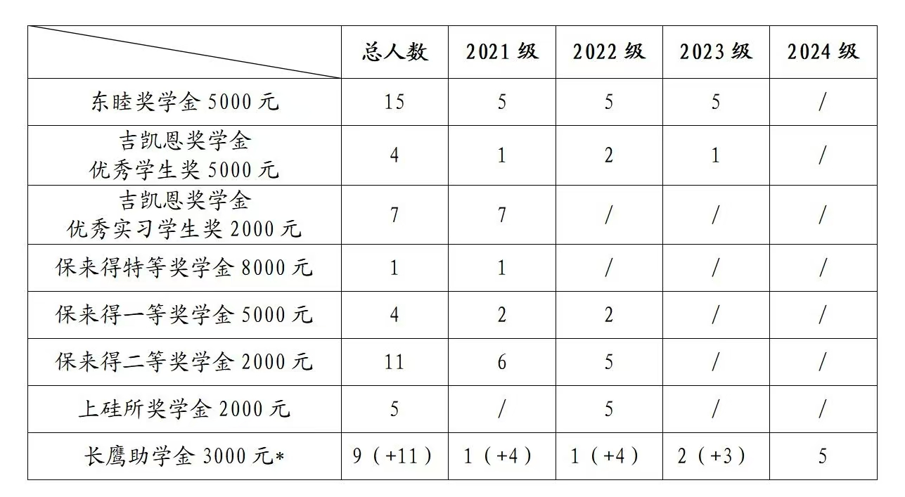 注:获上硅所奖学金同学需参加上海硅酸盐研究所大学生冬令营标“*”的为助学金(今年长鹰助学金评定原则调整为一年一评,往年已获该助学金本科生按获评当年规定执行)。最终奖项名额与等级以企业与学院沟通为准。