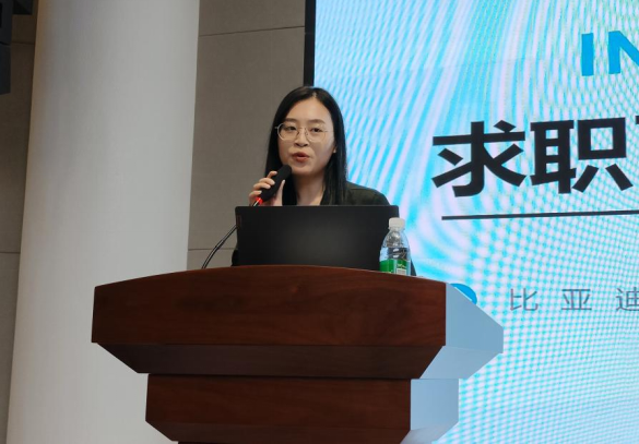 接着,比亚迪股份有限公司中华地区人力资源部总监罗雪从面试准备与面试技巧两方面为同学们答疑解惑。她通过讲解具体事例,向同学们分析了求职中的常见问题,介绍了简历应包含的内容以及需要注意的细节,并罗列了面试前应准备的资料等,对同学们的常见误区进行纠正。