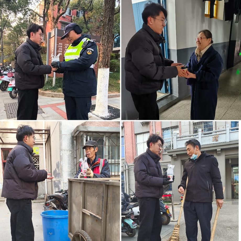研究生会的志愿者还这份温暖传递给了在寒风中坚守岗位的校内后勤工作人员,有保安、宿管、环卫工人等。这一杯杯姜茶,不仅是对他们辛勤工作的认可,也是对他们默默付出的感谢。