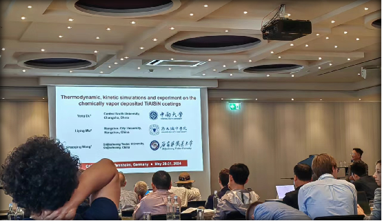 会上,杜勇教授作为会议委员担任“Posterpresentationaward judging committee”会场主持人,杜勇教授、王建川副教授和曾芳芳博士分别就“Thermodynamic, kinetic simulation and experiment on the chemically vapor deposited TiAlSiN coatings “、” First-principles study on the dehydrogenation thermodynamics and kinetics of Ti, Zr, V and Nb doped MgH2”和” Phase composition, microstructure and mechanical properties of CVD Ti-B-N coatings deposited at different temperatures guided by thermodynamic calculations”主题作精彩学术报告。文诗艺老师、博士生韩博、敬凤婷、高枫杨、张亮分别作海报展示,与参会人员展开学术交流。