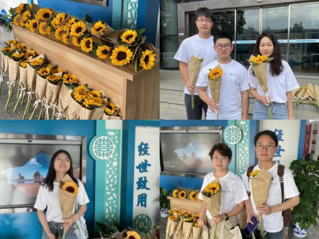 校本部三一大楼举办了“向阳而生,心向未来”粉冶毕业季暖心送花活动。盛放的向日葵布满了一楼大厅,毕业生同学可以凭借校园卡有序领取束束灿烂的向日葵。工作人员将捧花赠送给毕业生,同学们将向日葵花束,送给了陪伴毕业路的那个敬爱的老师,或是可爱的同学,或是奋斗的自己。