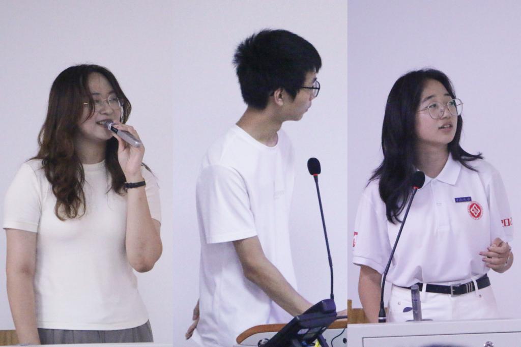 紧接着,毕鑫、刘松旭、李旻希同学作为老生代表依次上台分享。大一学年加权平均成绩年级第二名的毕鑫同学,向大家分享了许多实用的学习经验;刘松旭同学结合自身经历,鼓励大家多多参与学科竞赛;李旻希同学以院分团委学生会的工作为例,向大家介绍了学生工作的相关经验。