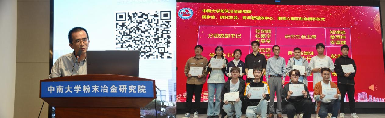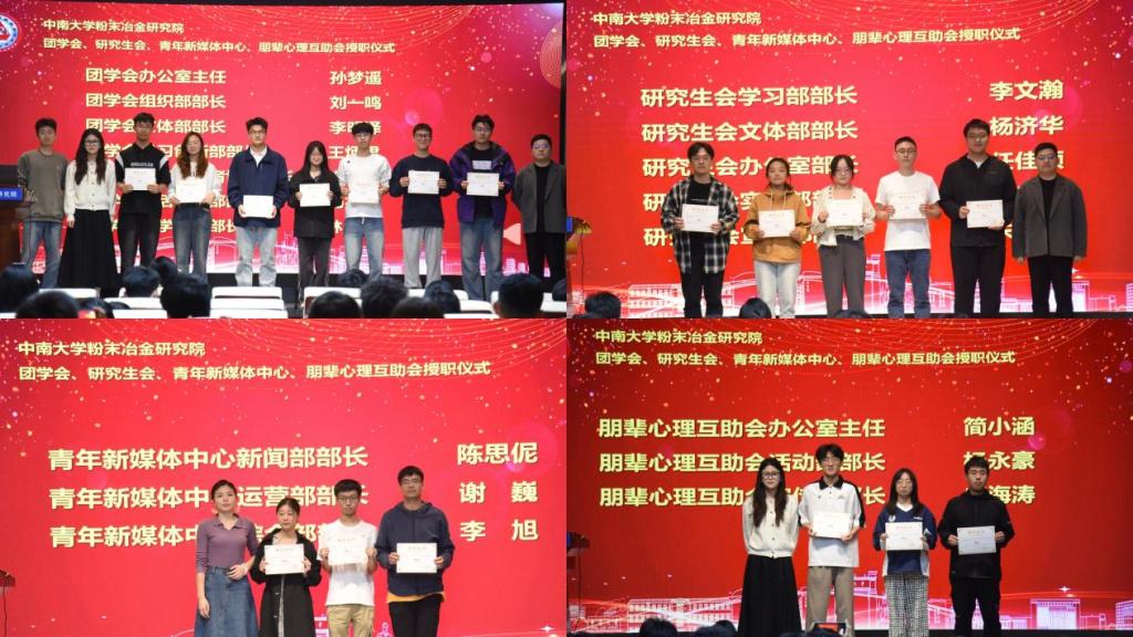 授职仪式上,黄书记和各组织指导老师为主席部长团成员颁发聘书,向他们表示祝贺。随后,黄书记进行讲话,对新一届院学生组织成员提出三点期望和要求:一是严格要求自己,发挥模范示范的表率作用,在工作、生活上成为其他同学的榜样;二是全心全意为广大师生服务,担当好学生干部的使命与责任;三是不断凝练发扬粉冶精神,提升自己的学习能力和工作水平。