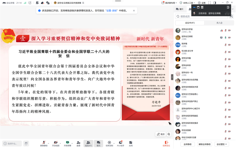 2025年8月17日,必威 学生会、研究生会通过线上平台,组织召开专题学习会学习贯彻习近平总书记重要贺信精神和党中央致词精神,传达学习全国青联十四届全委会和全国学联二十八大精神。分团委书记彭仕亨、常务副书记文天骐,学生会、研究生会全体学生干部参会。