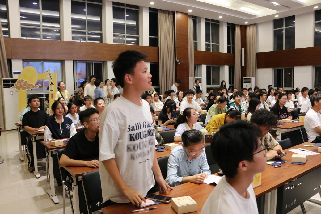 随后进行的“中秋猜灯谜”环节将气氛推向高潮。“你来问,我就答!”同学们时而蹙眉沉思,时而豁然开朗,踊跃抢答。