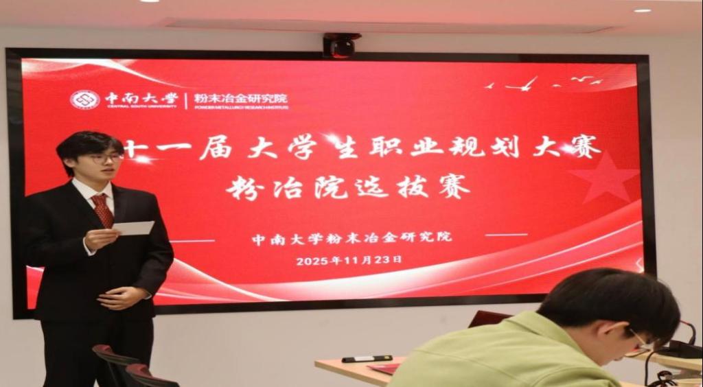 选拔赛在三一大楼顺利举行。粉冶院辅导员张翠、李卉淼、刘滨睿、于旻澍,第二届国赛金奖获得者黄绍祯共同担任评委。活动由周翔宇同学主持。