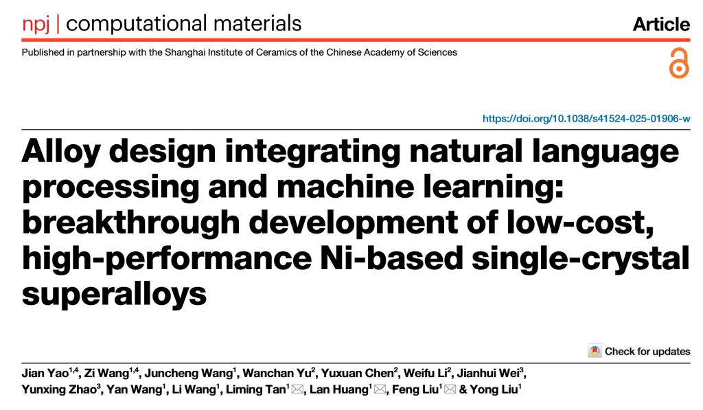 粉末冶金全国重点实验室高温合金研究团队在国际知名期刊npj Computational Materials上在线发表了题为“融合自然语言处理与机器学习的合金设计:低成本高性能镍基单晶高温合金的突破性开发(Alloy design integrating natural language processing and machine learning: breakthrough development of low-cost, high-performance Ni-based single-crystal superalloys)”的研究论文。