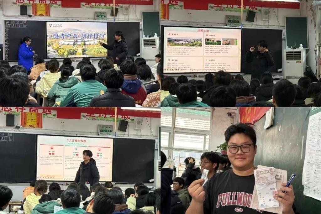活动当天,团队负责人张鑫与成员黄子阳、段雨佳深入高三年级,围绕“硬核中南”“魅力中南”“相约中南”三个方面,系统讲解了必威 的历史底蕴、学科优势、师资力量及科研实力,展现了校园学习生活环境。同时,团队成员结合安徽省近年招生政策与录取数据,为在场学生提供了针对性的备考指导和报考建议。