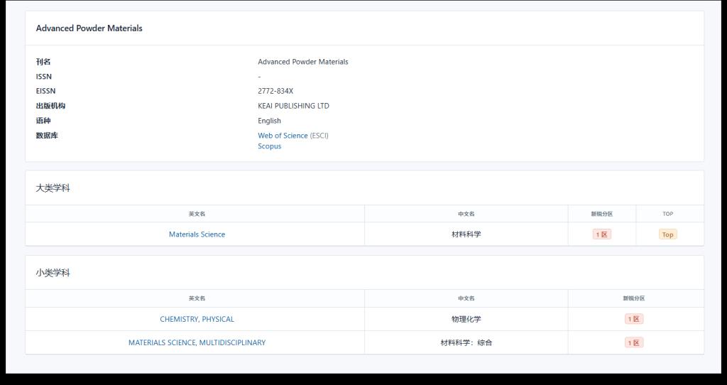 主办的期刊《先进粉体材料(英文)》,英文刊名Advanced Powder Materials(APM),入选大类学科材料科学1区Top;小类学科物理化学1区,材料科学(综合)1区。这标志着《先进粉体材料(英文)》的办刊质量、影响力和业内认可度已达到国际顶刊水平。