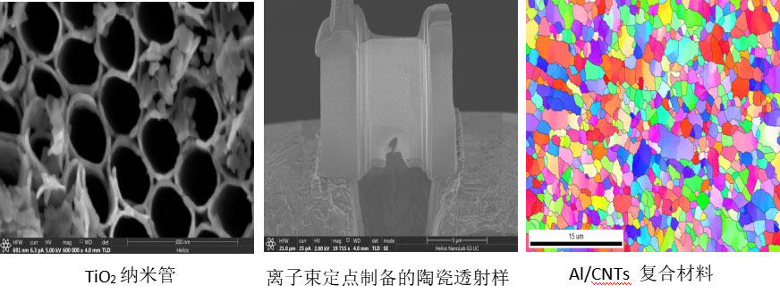 双束显微镜系统配备有多种探头:DBS、STEM、MD、ICD、TLD及ETD。可用于样品微观形貌观测,同时可对样品进行精密加工,包括:离子束刻蚀、离子束沉积、电子束沉积、高质量定点TEM样品制备,配合能谱及背散射衍射系统还可分析样品微区成分、测定晶粒取向分布。