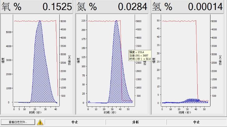 测试原理:分析时,样品置于石墨坩埚中,在脉冲电极炉和惰性气氛下熔融,样品中氧氮氢元素以CO,CO2,H2,N2形式释放,CO氧化成CO2,H2氧化成H2O,首先通过H2O红外池测定氢含量;然后通过2个CO2红外池,1个CO红外池及氧校正装置测定氧含量;经过无水高氯酸镁和碱石棉去除CO2,H2O,再通过氮校正装置,最后检测氮含量。