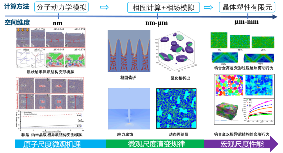 针对航空航天用金属结构材料服役过程面临的高温、高压、高应变和高盐等复杂极端环境,利用晶体塑性有限元、相场模拟、分子动力学、相图计算等多尺度计算方法,结合深度学习,深入研究航空航天用高强铝合金和钨合金等金属结构材料在极端环境下的多尺度组织演变机理,以及电化学腐蚀、力学变形和损伤失效等行为。