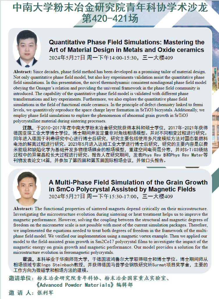 报告人:汪凯时间:2024年5月27日周一下午14:00-15:30地点:三一大楼409Abstract: Since decades, phase field method has been developed as a promising tailor of material designNot only quantitative phase field model. but also key experiments validation assist the quantitative phasefield simulations. In this presentation, the novel thermodynamic consistent nondiagonal phase field modelobeying the Onsa...